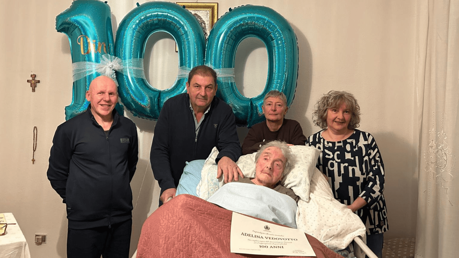 Da circa vent’anni è allettata, ma continua a essere circondata da grande affetto ed è accudita con amore dalle sue figlie. La sua famiglia si è allargata nel tempo: tre nipoti l’hanno resa bisnonna di cinque pronipoti, una ricchezza che racconta una vita piena.